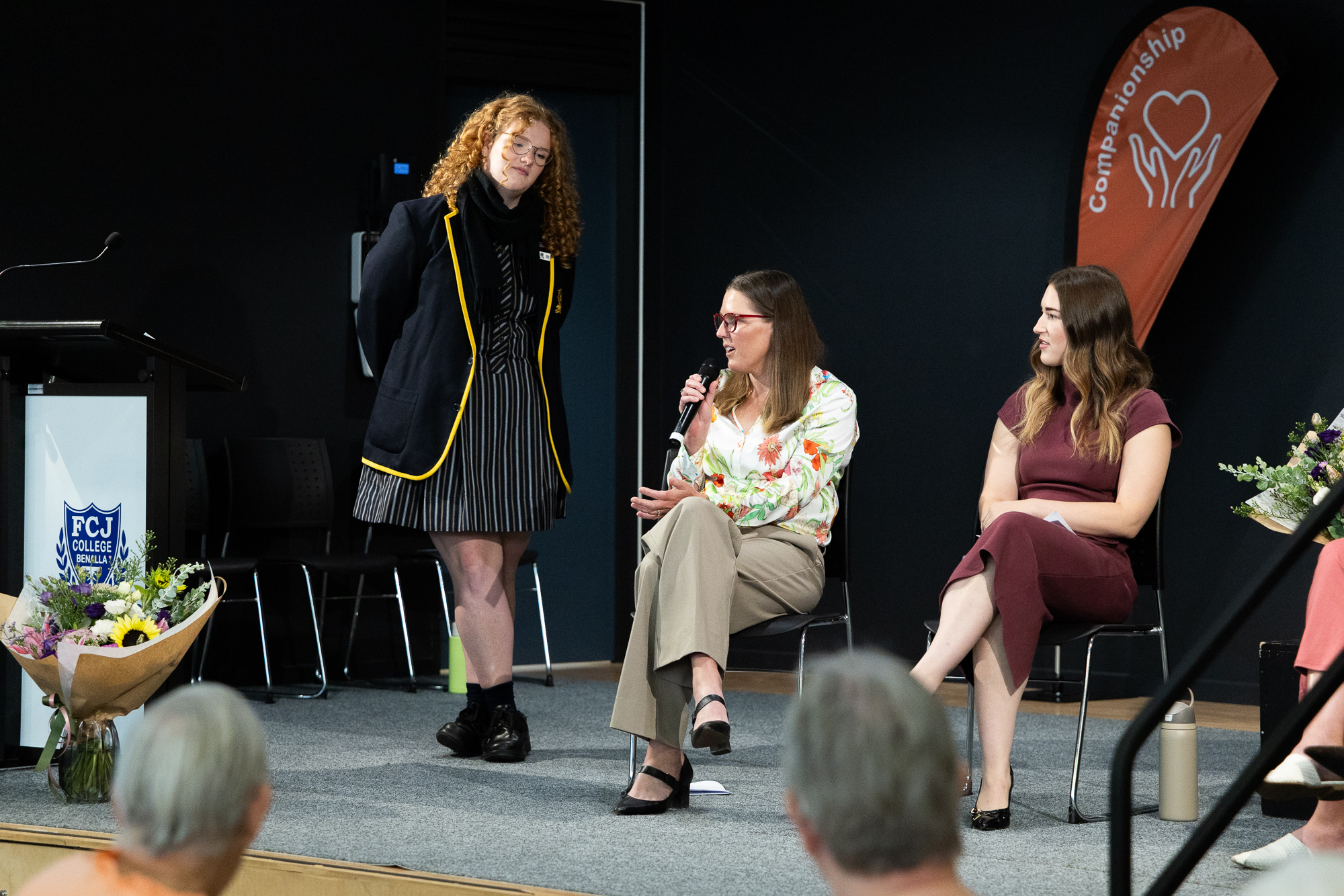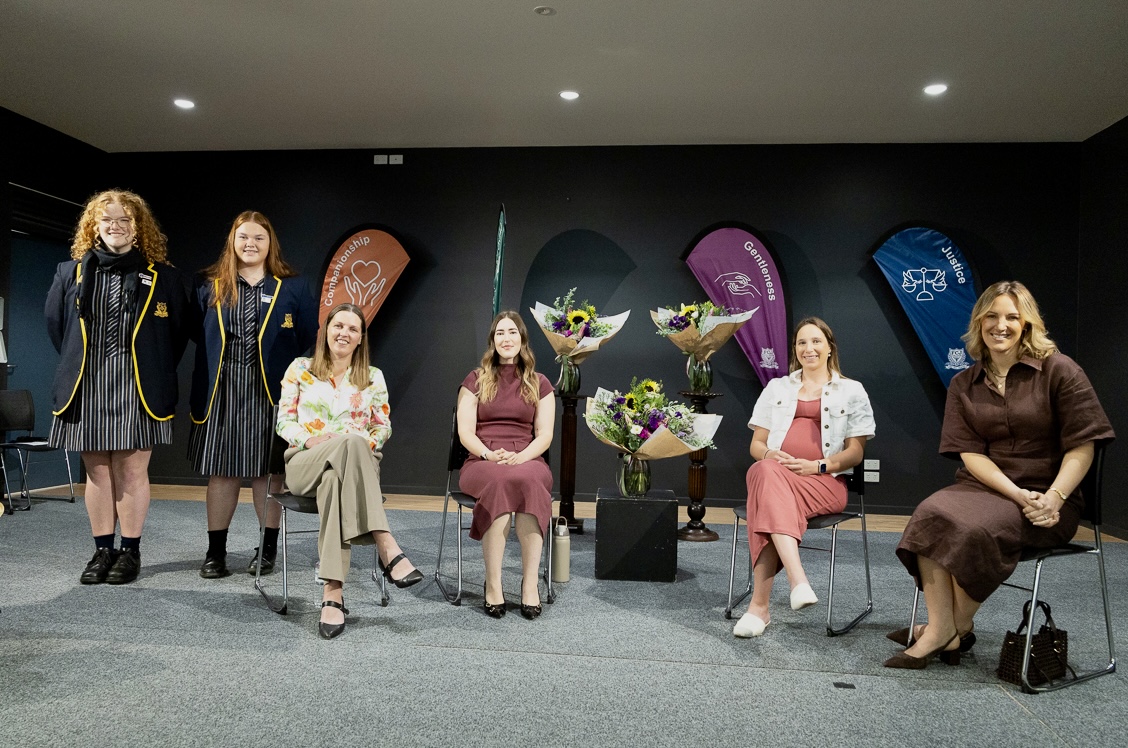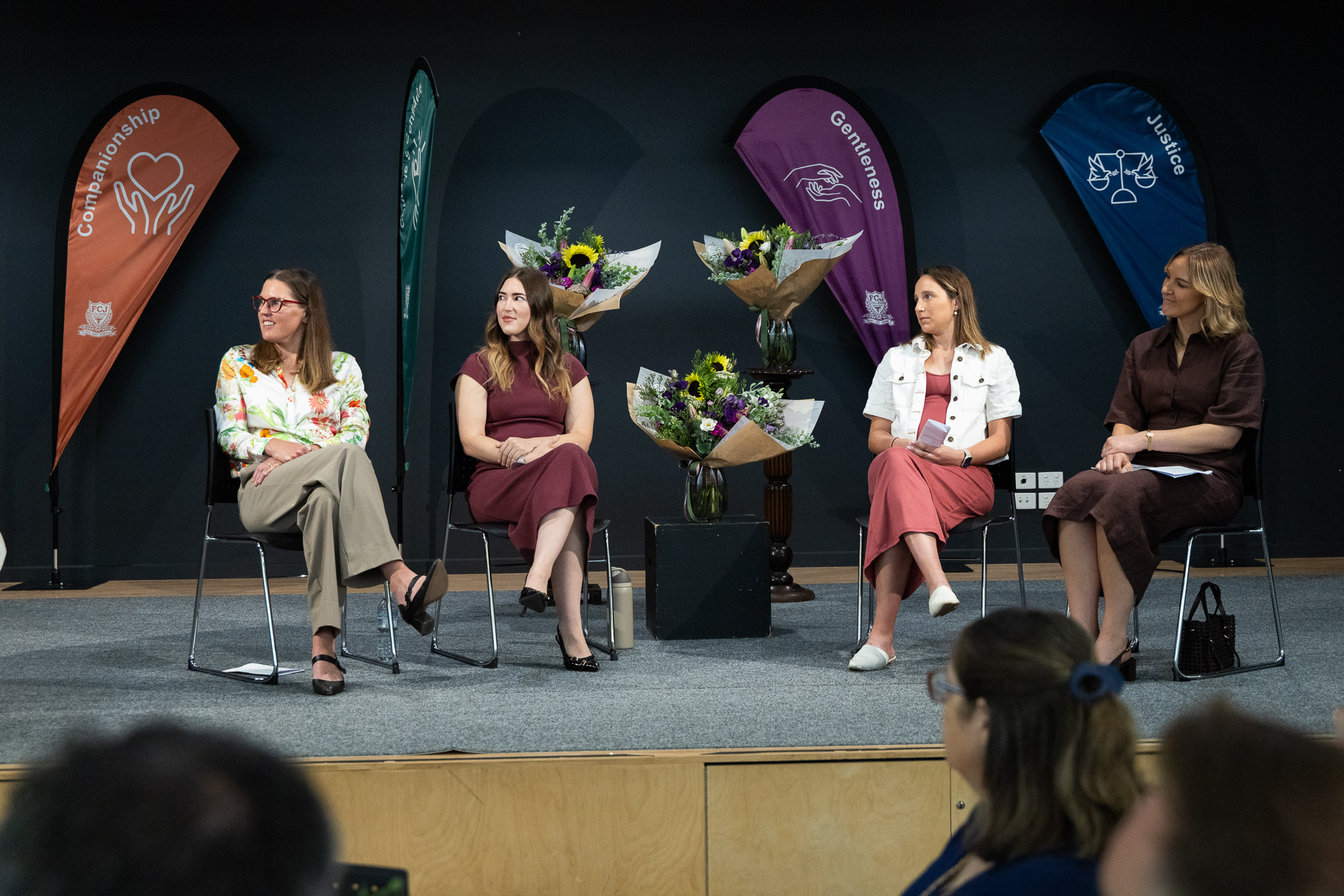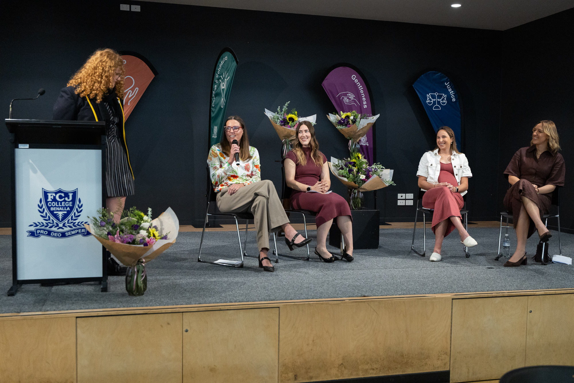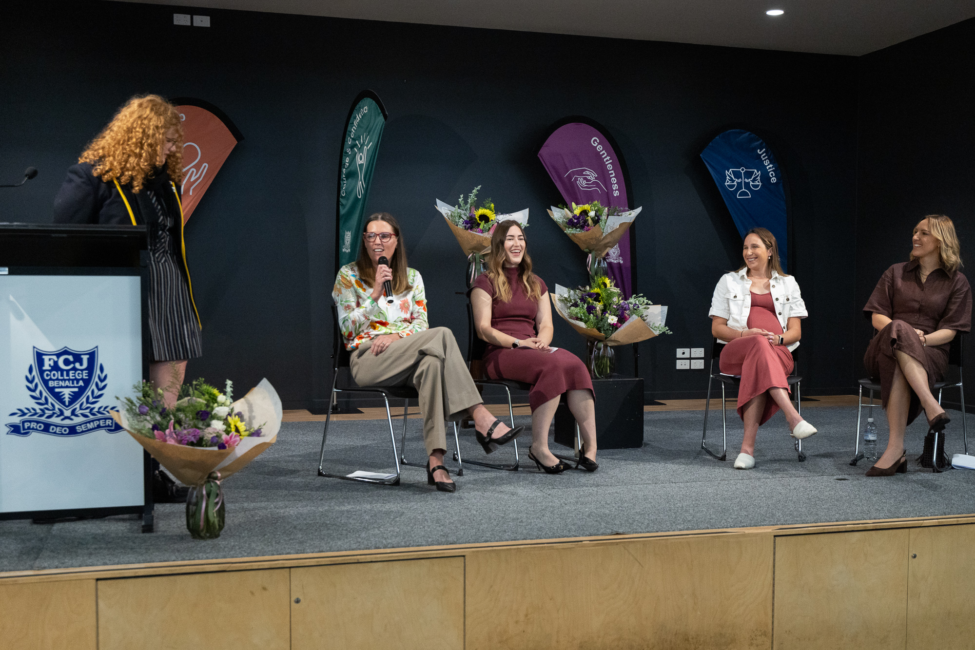 A highlight of the morning was the alumni panel featuring Liz Hayes, physiotherapist; Tymicka Pierce, policy officer at the Department of Energy, Environment and Climate Action; Sarah Osborne, psychologist; and Rachel Tharratt, senior media manager at Bunnings Group. The panel generously shared insights into leadership, resilience, and the opportunities that can grow from an FCJ College education.